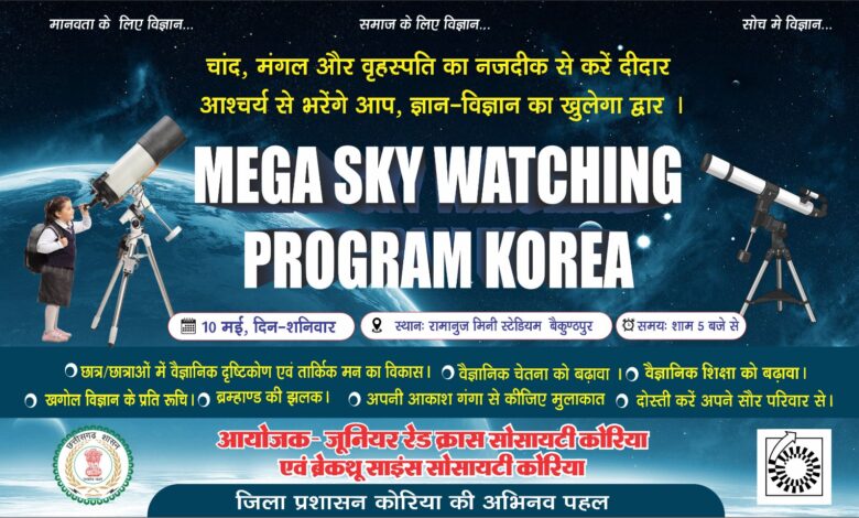कोरिया/ जिला प्रशासन कोरिया की अभिनव पहल के तहत 10 मई को रामानुज मिनी स्टेडियम, बैकुण्ठपुर में एक अनोखा और रोमांचक कार्यक्रम ‘मेगा स्काई वॉचिंग प्रोग्राम’ आयोजित किया जा रहा है। शाम 5 बजे से शुरू होने वाले इस कार्यक्रम का उद्देश्य विद्यार्थियों में वैज्ञानिक दृष्टिकोण, तार्किक मन और खगोल विज्ञान के प्रति रुचि को बढ़ावा देना है।