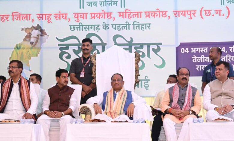 रायपुर / मुख्यमंत्री विष्णुदेव साय रविवार को हरेली तिहार के पवित्र दिन तेलीबांधा स्थित मरीन ड्राइव पर आयोजित हरेली उत्सव और साहू समाज के सम्मान समारोह में शामिल हुए। मुख्यमंत्री विष्णुदेव साय ने यहां नागर, गैती, गेड़ी सहित कृषि यंत्रों की पूजा की और प्रदेश के किसानों की खुशहाली के लिए ईश्वर से प्रार्थना की। साय ने भक्त माता कर्मा के तैल चित्र पर पुष्पांजलि अर्पित कर आरती की और छतीसगढ़ की सुख-समृद्धि की कामना की। कार्यक्रम में उपमुख्यमंत्री अरुण साव, केंद्रीय राज्य मंत्री तोखन साहू, रायपुर ग्रामीण विधायक मोतीलाल साहू, कसडोल विधायक संदीप साहू, पूर्व मंत्री चन्द्रशेखर साहू सहित साहू समाज के अध्यक्ष टहल सिंह साहू और अन्य पदाधिकारी भी मौजूद रहे।