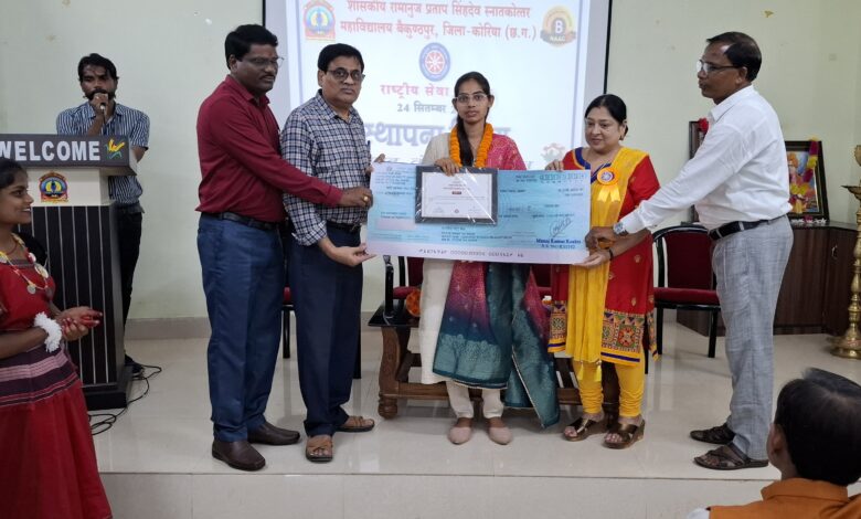 रासेयो कार्यक्रम अधिकारी डॉ. श्रीमती प्रीति गुप्ता ने स्वागत उद्बोधन देते हुए राष्ट्रीय सेवा योजना के स्थापना दिवस पर प्रकाश डाला एवं राष्ट्रपिता महात्मा गांधी तथा स्वामी विवेकानंद के व्यक्तित्व से प्रेरणा लेकर समाज सेवा करते हुए राष्ट्र निर्माण में अपनी भूमिका निर्वहन करने के लिए प्रेरित किया। तद्ुउपरांत राज्य स्तर पर श्रेष्ट स्वयं सेवक के रूप में मुख्यमंत्री के हाथों सम्मानित हुए कु. संगीता यादव का महाविद्यालय परिवार की ओर से स्वागत किया गया और बधाई एवं शुभकामनांए दी गई। इस अवसर पर स्वयं सेवकों ने सांस्कृतिक कार्यक्रम की प्रस्तुति दी जिसमें तुनप्रिया एवं ग्रुप के द्वारा छत्तीसगढ़ी समूह नृत्य, संजना एवं ग्रुप के द्वारा नागपुरी नृत्य, दिव्या एवं ईशा तथा धनेश्वर एवं नीरज द्वारा युगल नृत्य, साक्षी, लवकुश के द्वारा एकल नृत्य की प्रस्तुति दी। उद्बोधन के क्रम में डॉ. जे.आर.कवंर ने कहा कि राष्ट्रीय सेवा योजना समाज के अवधारणा एवं संगठन को समझने तथा समाज की समस्याओं से अवगत होकर अपने व्यक्तिव विकास करने का एक बेहतर प्लेटफॉर्म है। डॉ. बृजेश कुमार पाण्डेय ने भी स्वयंसेवको को सम्बोधित किया। महाविद्यालय के प्राचार्य डॉ. ए.सी.गुप्ता के द्वारा स्वामी विवेकानंद के विचारों को पढ़कर समझकर आत्मसात करने और राष्ट्रहित में कार्य करने की प्रेरणा दी तथा महाविद्यालय में आयोजित होने वाले विभिन्न गतिविधियां एवं प्रतियोगिताओं में भाग लेने के लिए प्रेरित किया। जिला संगठक ने रासेयो की स्थापना दिवस 24 सिंतबर 1969 से लेकर आज तक एन.एस.एस. के युवाओं द्वारा समाज और राष्ट्रहित के लिए किये गये सेवा कार्यो पर प्रकाश डाला तथा कहा कि रासेयो आपके व्यक्तित्व को शून्य से शिखर तक ले जाता है। आप इस योजना के माध्यम से अपनी प्रतिभा को निखारकर अपना एक पहचान स्थापित कर सकते हैं। अंत में कार्यक्रम अधिकारी श्री अनुरंजन कुजूर ने आभार प्रदर्शित किया। इस अवसर पर महाविद्यालय के प्राध्यापक डॉ.गौरव कुमार मिश्र, डॉ. विनय कुमार शुक्ला, डॉ. आशुतोष देऊस्कर, श्री भूपेन्द्र सिंह, शम्भू प्रसाद रैदास, डॉ. रामयश पाल भी उपस्थित रहे। कार्यक्रम का संचालन वरिष्ट स्वयं सेवक कृष्णा राजवाड़े एवं कु. तनुप्रिया यादव ने किया । कार्यक्रम के सफल आयोजन में स्वयंसेवक आकाश सिंह, तौफिक, अंकित जायसवाल, निखिल साहू, साक्षी, मुस्कान, धनेश्वर, नीरज, सुशील, लवकुश, श्रेयश, खुशबू, सुनैना, संजना की अहम भूमिका रही।