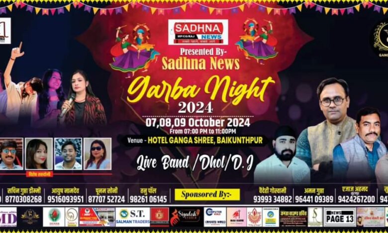 बैकुंठपुर/ शहर में शारदेय नवरात्रि के अवसर पर स्थानीय होटल गंगा श्री में तीन दिवसीय सात आठ और नौ अक्टूबर को साधना न्यूज़ ग्रुप के तत्वाधान में लाइव बैंड, ढोल,डीजे की मस्ती के साथ गरबा नाइट का आयोजन होगा ।