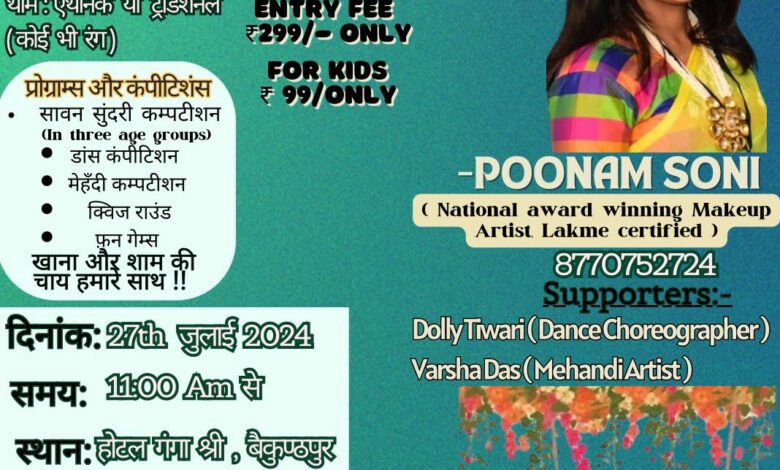 बैकुंठपुर/ विगत वर्षों के भांति इस वर्ष भी टच एंड ग्लो चेरिस सैलून एंड एकेडमी द्वारा पवित्र श्रावण मास के उपलक्ष्य में ‘आया सावन झूम के’ सावन उत्सव का आयोजन दिनांक 27 07.2024 दिन शनिवार को स्थानीय गंगा श्री होटल सभागार में किया गया है ।